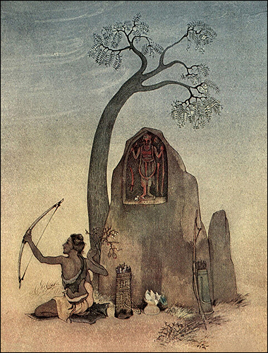 একলব্য দ্রোণের একটি মাটির ভাস্কর্যের সামনে ধনুর্বিদ্যা অনুশীলন করছেন। শিল্পীঃ নন্দলাল বসু।