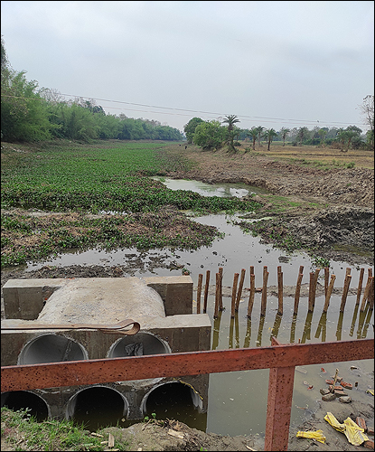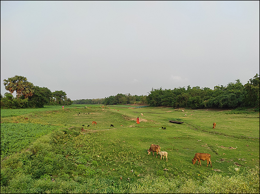 শীর্ণ নদী কোনো রকমে বয়ে যাচ্ছে। শুষ্ক কলিঙ্গের উৎস আগাছায় ঢাকা। জলঙ্গী তার অনেক নীচ দিয়ে বয়ে যাচ্ছে। ইটভাটা দুইদিক থেকে চেপে ধরেছে কলিঙ্গের মুখ থেকে বাঁধ পর্যন্ত।"