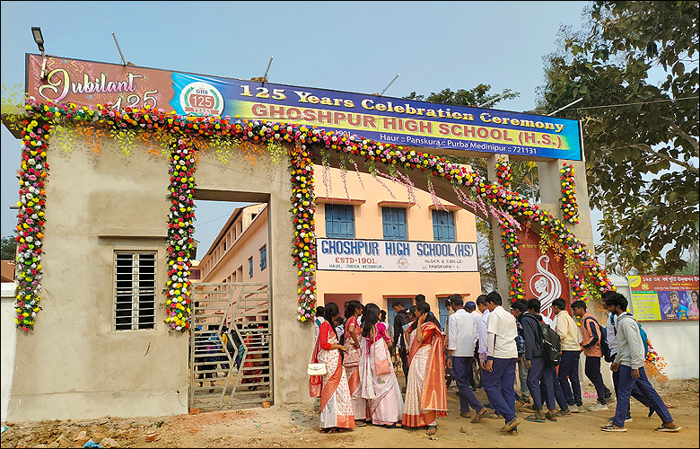 সংবাদদাতা - সমীরণ ভৌমিকঃ 'হিমেল হাওয়ার পরশ বুলায়ে/ কুহেলি চাদর ধরায় লুটায়ে/ এসেছে শীতের শীতল বেলা, সেই অবসরে উঠিয়াছি মাতি/ করিতে সোয়া-শত দীপারতি/রচিতে যে চাই মিলনমেলা'।পূর্ব মেদিনীপুর জেলার পাঁশকুড়া ব্লকের অন্তর্গত ঘোষপুর উচ্চ বিদ্যালয় (উ.মা)১২৫ তম বর্ষ পূর্তি উদযাপন উৎসব-২০২৫ অনুষ্ঠিত হয়ে গেল ০২.০১.২০২৬ শুক্রবার থেকে ০৩.০১.২০২৬ শনিবার পর্যন্ত। গত ০২.০১.২০২৬ শুক্রবার, সকাল ৯টায় অনুষ্ঠিত হলো বর্ণাঢ্য শোভাযাত্রা, দুপুর ১.৩০টায় উদ্বোধনী অনুষ্ঠান, বিকাল ৫টায় বৈচিত্র্যপূর্ণ সাংস্কৃতিক অনুষ্ঠান "মায়াবিনী"। পরিবেশনায় বর্তমান ছাত্রছাত্রী, শিক্ষক শিক্ষিকা ও শিক্ষাকর্মীবৃন্দ। আজ ০৩.০১.২০২৬, শনিবার, বেলা ১১ টায়- "চলে যেতে যেতে দিন বলে যায়" প্রাক্তন ছাত্র ছাত্রীদের সম্মেলন। দুপুর একটায় গুণীজন সম্বর্ধনা। উক্ত অনুষ্ঠানে উপস্থিত ছিলেন পাঁশকুড়া ব্লকের শ্যামসুন্দর পাটনা উচ্চ মাধ্যমিক বিদ্যালয়ের প্রাক্তন শিক্ষক সম্মানীয়, বিশিষ্ট শিক্ষাবিদ গৌতম বোস মহাশয়। যিনি আজ উদ্বোধন করলেন ঘোষপুর উচ্চ বিদ্যালয়ে দোতলার একটি বড় হলঘরে 'Shree Jain Digital Library'। বিকাল ৩টায় অতিথি বরণ। মঞ্চে উপস্থিত ছিলেন ঘোষপুর উচ্চ মাধ্যমিক বিদ্যালয়ের ম্যানেজিং কমিটির সভাপতি সম্মানীয় প্রদ্যুৎ রায় মহাশয়। উপস্থিত ছিলেন পাঁশকুড়া ব্লকের বার্লিবার হাই স্কুলের (শিক্ষারত্ন পুরস্কারপ্রাপ্ত) শ্রদ্ধেয় মানস রায় মহাশয়। উপস্থিত ছিলেন সম্মানীয় ডঃ পার্থ কর্মকার(W.B.Board Primary Education) আধিকারিক। ছিলেন মঞ্চে সম্মানীয় দেবাশীষ সরকার (O.S.T), উপস্থিত ছিলেন মাননীয় চিন্ময় সরকার, বর্তমান (W.B.B.S.E) বিভাগের আধিকারিক। উপস্থিত ছিলেন হাউর অঞ্চলের সম্মানীয়া ছন্দা জানা মন্ডল (প্রধান)। মঞ্চে উপস্থিত ছিলেন সম্মানীয়া কলিকাতার সল্টলেক(লবণ হ্রদ গার্লস স্কুলের ) সহকারি প্রধান শিক্ষিকা স্বাতী কর্মকার। যিনি মঞ্চে বর্তমান স্কুলের ছাত্র-ছাত্রীদের উদ্দেশ্যে তাঁর সুললিত সুবক্তব্য এবং দর্শকদের অনুরোধে গেয়েছিলেন একটি রবীন্দ্রসঙ্গীত। যা দর্শকদের মন কানায় কানায় ভরিয়ে তুলেছিলেন। এছাড়াও মঞ্চে উপস্থিত ছিলেন এই স্কুলেরই প্রাক্তন ছাত্র, বর্তমান DRDO Scientist সম্মানীয় ডঃ বাপ্পাদিত্য জানা মহাশয়। যিনি স্কুলের ছাত্র-ছাত্রীদের উদ্দেশ্যে এবং মঞ্চে উপস্থিত গুণী ব্যক্তি এবং অতিথিদের উদ্দেশ্যে তাঁর ইংরেজিতে একটি জীবনমুখী, বাস্তববাদী বক্তব্য রাখেন। দুই দিন ব্যাপী মঞ্চে উপস্থাপিত অনুষ্ঠানটি সুন্দরভাবে সঞ্চালকের দায়িত্বে ছিলেন স্কুলের প্রাক্তন ছাত্র সুকদেব শাসমল মহাশয়। এই মুহূর্তে আমরা স্মরণ ও মরণ করি বিশ্ব মহামানব স্বামী বিবেকানন্দের জগৎবাসীর উদ্দেশ্যে সেই অমৃত বাণী "জীবনে এসেছ যখন একটা দাগ কেটে যাও"। সত্য