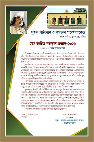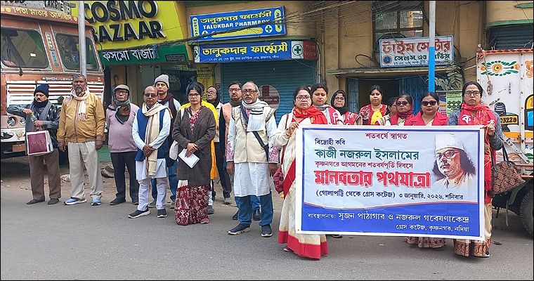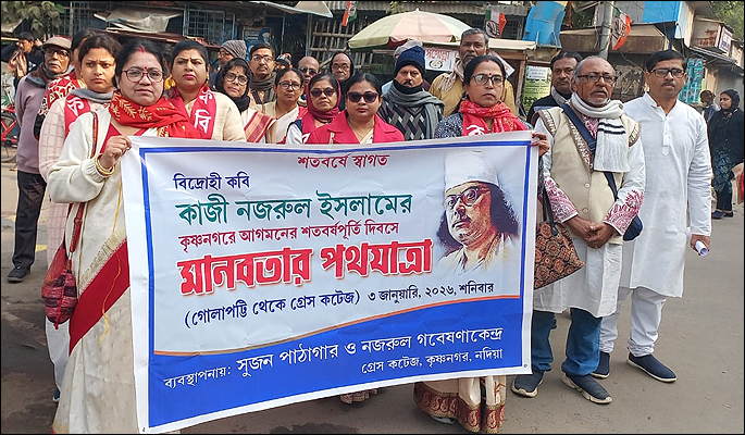 সংবাদদাতা - ইনাস উদ্দিনঃ ৩রা জানুয়ারি, ২০২৬ ছিল কৃষ্ণনগর শহরে বিদ্রোহী কবির আগমনের শতবর্ষ পূর্তির দিবস। ১৯২৬ সালে হুগলি থেকে শারীরিক ও সাংসারিক ভাবে বিপর্যস্ত কবিকে সপরিবার কৃষ্ণনগরে নিয়ে এসে আশ্রয় দেন বিপ্লবী নেতা হেমন্তকুমার সরকার। প্রথমে তাঁদের পৈতৃক বাস ভবনে সাত-আট মাস, পরে গ্রেস কটেজ ভবনে কবি বসবাস করেন - মোট প্রায় তিন বছর।