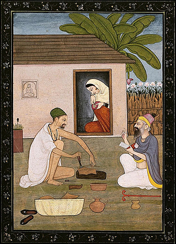 সদগুরু রবিদাস জী মহারাজ পাদুকা তৈরিতে ব্যস্ত।