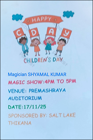 শিশু দিবস (১৪ নভেম্বর, ২০২৫) উপলক্ষে নিউ টাউনে, 'টাটা মেডিকেল সেন্টার'-এর 'প্রেমাশ্রয় প্রেক্ষাগৃহ'-এ অনুষ্ঠিত হল এক প্রাণবন্ত সাংস্কৃতিক অনুষ্ঠান। সল্টলেকের সমাজসেবী সংস্থা 'ঠিকানা'-র উদ্যোগে ১৭ নভেম্বর আয়োজিত এই অনুষ্ঠানের বিশেষ আকর্ষণ ছিল এক মনোমুগ্ধকর ম্যাজিক শো। প্রদর্শনীতে উপস্থিত ছিলেন জনপ্রিয় জাদুকর শ্যামলকুমার।